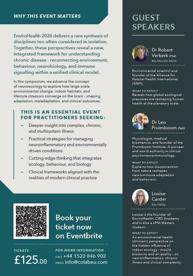 Why This Event Matters: EnviroHealth 2026 offers a rare synthesis of disciplines that are too often overlooked or seen as distinct. Together, these three perspectives reveal a new, integrated model for understanding chronic disease — one that reconnects environment, behaviour, neurobiology, and immune signalling into a single coherent framework. In this symposium, we introduce the concept of neuroecology to explore how large-scale environmental changes, our physical indoor habitats, and lifestyle stressors converge on the brain — driving adaptation, maladaptation, and clinical outcomes. We redefine the brain not as an isolated organ but as situated within ecology, architecture, and exposure and in the context of the wider human physiology. This is an essential event for practitioners seeking: